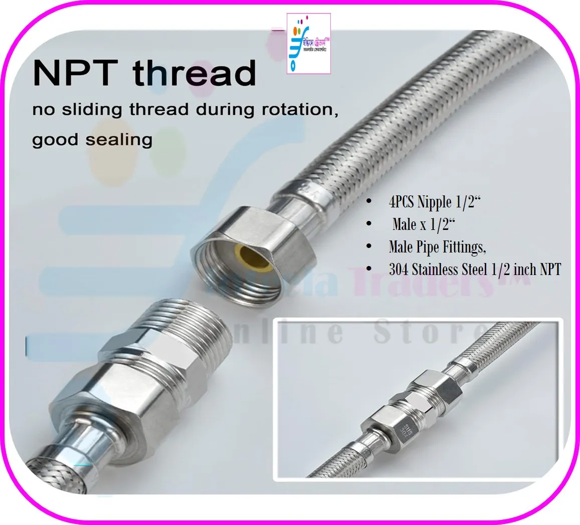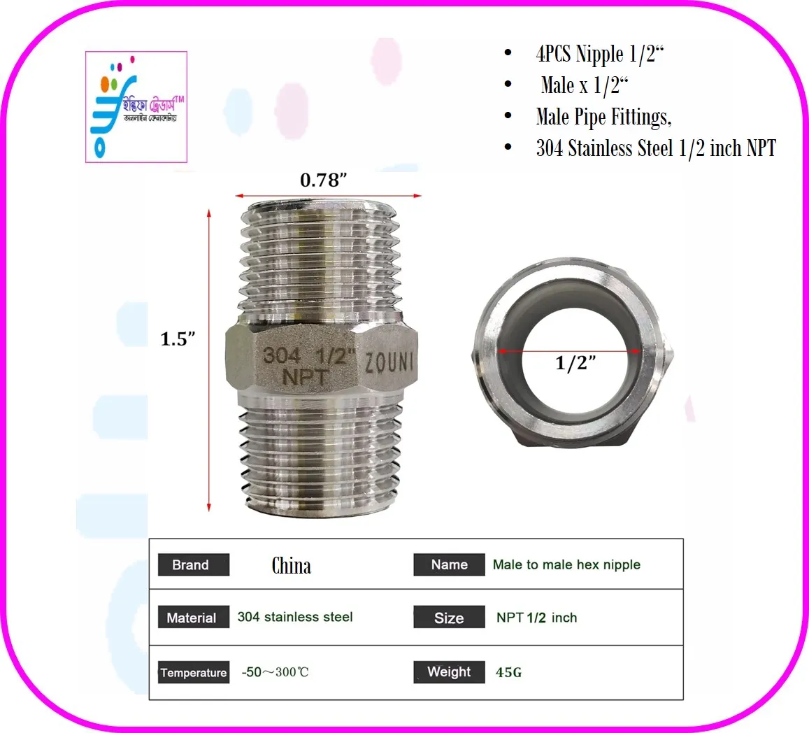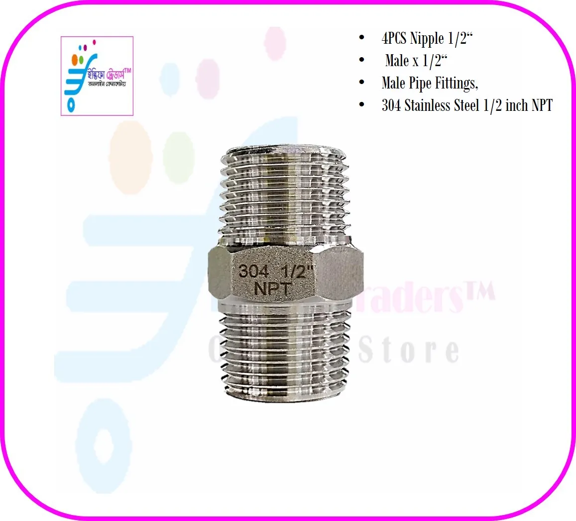 Product details of 4PCS Nipple 1/2″ Male x 1/2″ Male Pipe Fittings, 304 Stainless Steel 1/2 inch NPT Male Threaded Pipe Adapter Fittings Equal Nipples Connectors, Male Straight Connector Pipe Fitting