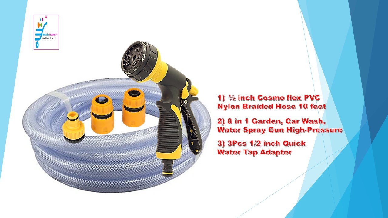 Heavy Duty Hose Nozzle Water Spray High Pressure for Gardening, Flower, Plants, Lawn, Multi Functional Cleaning, Showering Pet & Wash Cars,5 Function Spray Gun ( ½ inch 10 feet Hose, 1pcs Spray Gun, 3 pcs Quick Water Tap Adapter- Combo pack) ABS plastic